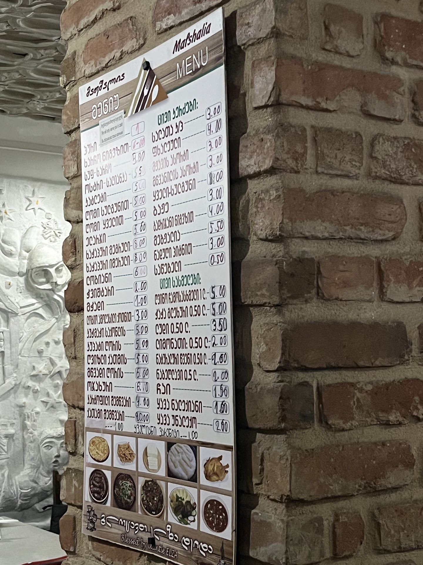 The menu is pretty simple with just 2 sides on 1 menu slide with cold dishes, beverages, and hot dishes. They have a lot of popular local Georgian dishes here so if you have a bucket list (like I had) this place is the place to go. The prices at the time also seemed pretty decent as well. Keep in mind that you can only pay in cash as well.