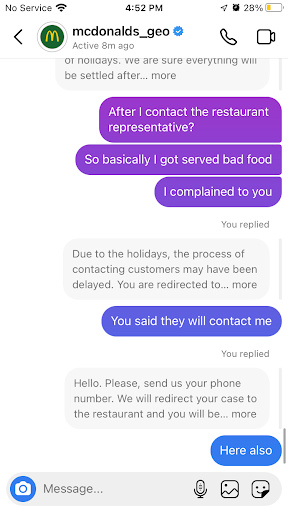 Instead of offering a discount, a complimentary item, or even a simple apology, two McDonaldâs employees brought our order 55 minutes after payment. The burgers and nuggets were cold, and they spoke to us in Georgian (even though I had told them in Georgian that I didnât understand the language). One of the employees even said âhappy birthdayâ as he put the tray on the table, which felt like mockery.