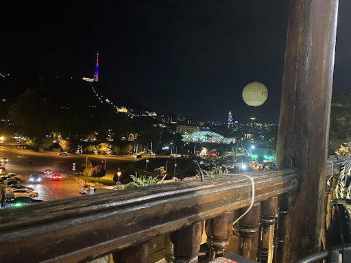 This is a quiet little place that’s easy to miss. The tables and walls inside are hand painted and quirky, but the real USP of the place is its balcony. You sit at a table there, with the railing and pillars made out of old wood with the most beautiful grain, and look onto the cobbled street below, hear someone playing songs from the 90s or even the 60s, and look at the river Kura with lights shimmering on it, and the gentle arc of the Bridge of Peace, and the city lights on the hills a little further away. You can see the boxes moving on the funicular line to the top of the hill, and there was a huge hot air balloon (not sure if it carries people or if it’s just an advertisement or some such). I only had a homemade lemonade and “Beans in a Pot”. I’m vegetarian and there were plenty of other vegetarian and what looked like vegan options. The lemonade was what the doctor ordered after a long walk in the city. And the Beans in a Pot was comfort itself - red kidney beans, spices and a coriander garnish. It was like rajma in north India, but with different spice notes from the ones we have. I wished I could have a squeeze of lime on the side though, but that’s just me with my Indian palate. I’ll go back certainly to try their khachapuri and some other Georgian cheesy delights and vegetable dishes on their menu. The service was great, though the staff seemed a bit overworked, they had to be on the run all the time, and still managed to pay attention to all the tables and really made me...