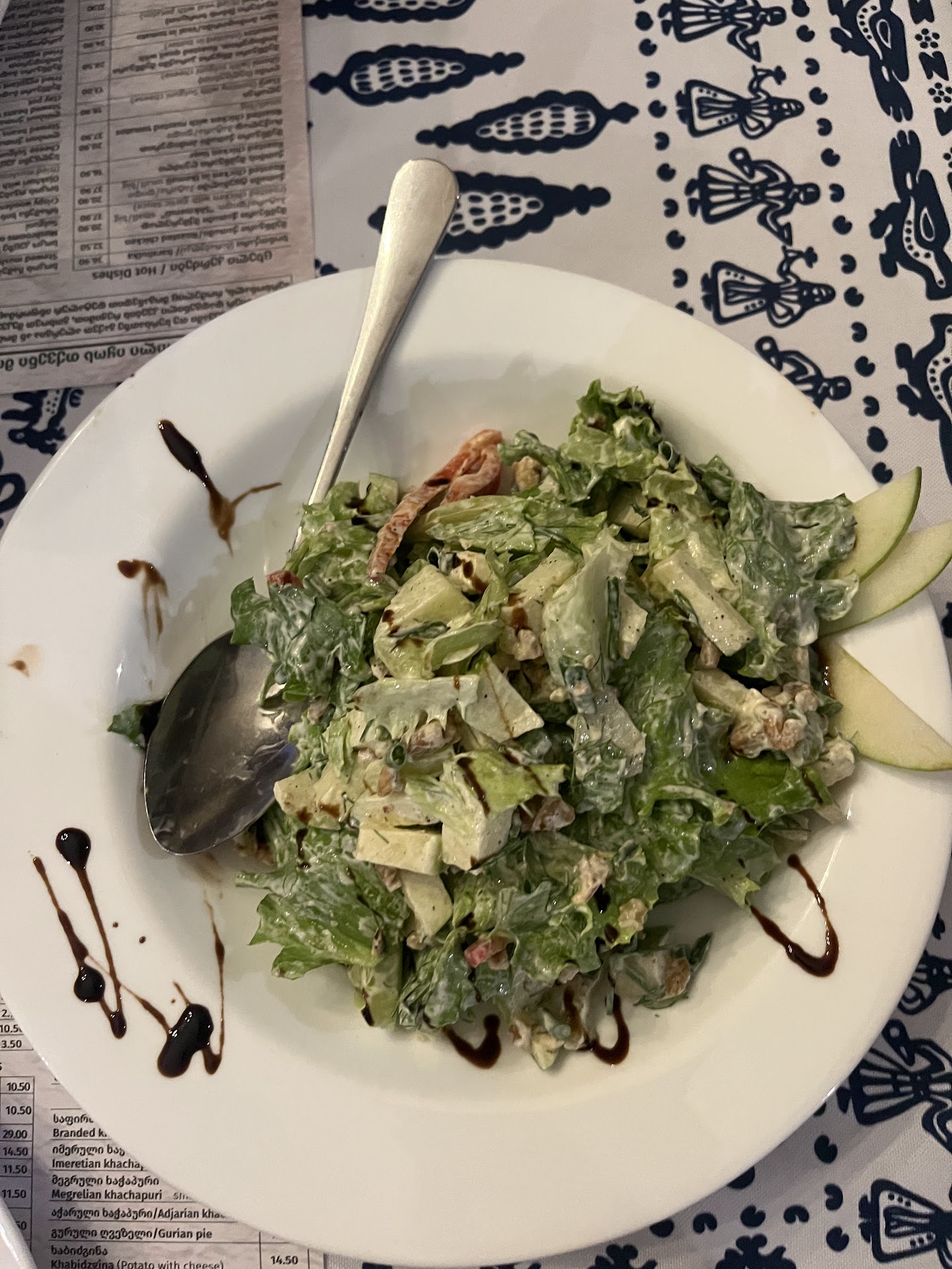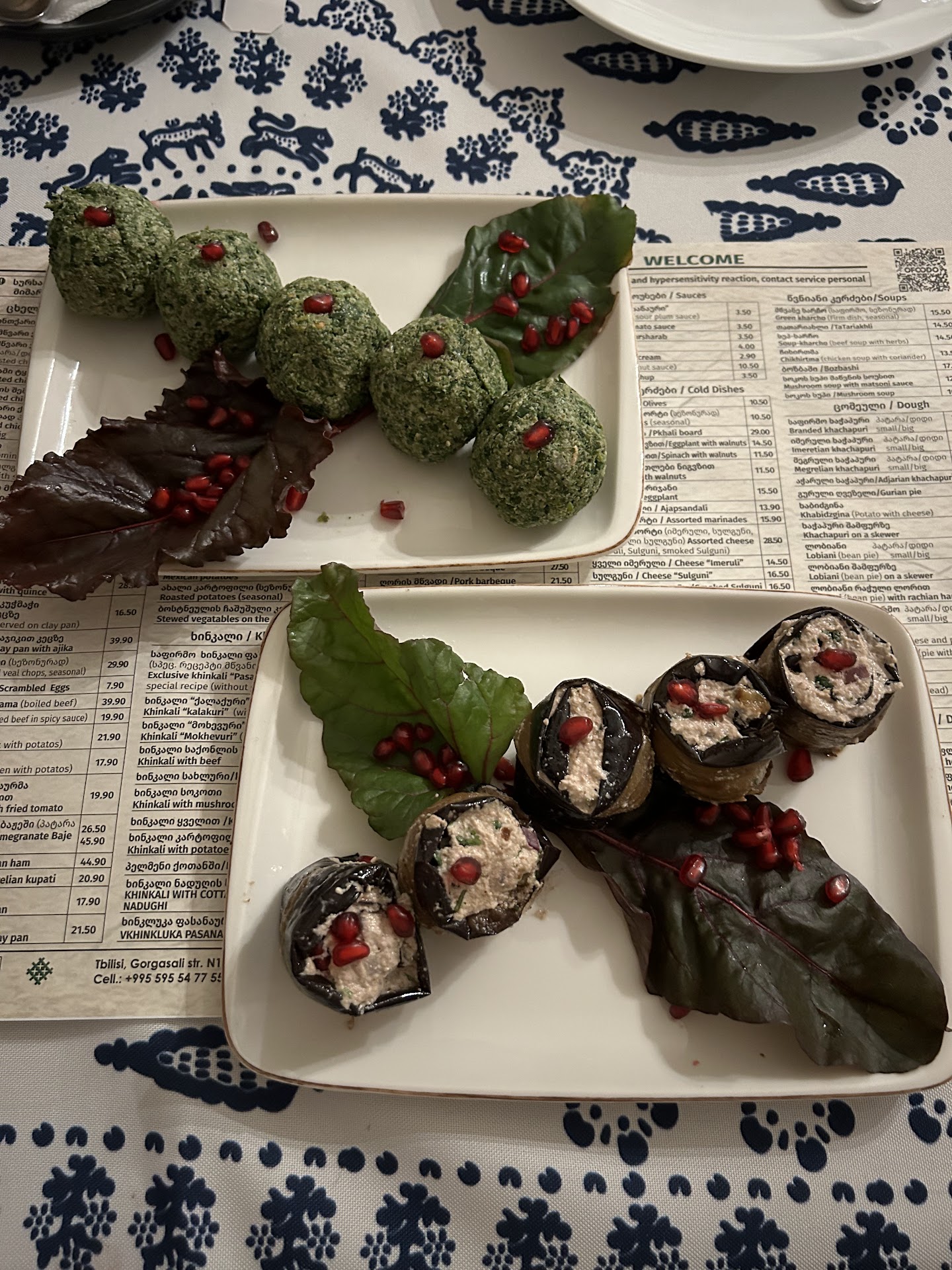 I had lunch there on a weekday. I ordered their khinkali with potatoes (no minimum pieces to order, from my recollection), eggplant with walnuts, and spinach with walnuts. For one person, this was a lot! I was still new to Georgian cuisine so didn't know about their portion size and how filling their dishes can be. So I had to request to take away any I didn't finish. Everything tasted very good and tasty. The walnut dishes tasted fresh.