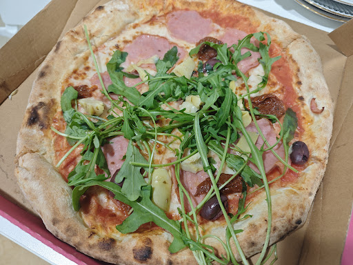The crust was thin, Italian-style, which could have been pleasant… if it hadn’t been covered with the absolute minimum of toppings: a few tiny pieces of artichoke, a couple of tomato bits, three lonely olives, and, to make it look generous, a mountain of arugula on top to hide the emptiness underneath.