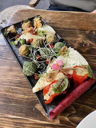 The platter features a selection of artisanal cheeses, each with its own character, alongside vibrant pkhali—a delightful medley of minced vegetables and herbs bound together with rich walnut paste. Complementing these, succulent slices of aubergine adorned with the nutty richness of walnut paste add another layer of indulgence.