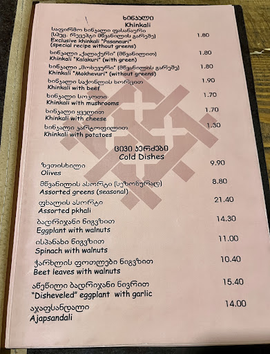 The menu was challenging to navigate. In the section where the English names of dishes are listed, most entries only provided the Georgian names without any descriptions. Occasionally, the English descriptions were so vague that it was hard to understand what the dish actually was. For instance, one of the Georgian desserts was simply labeled "cake," with no indication of its Georgian name or any details about the type of cake. Additionally, out of the ten desserts listed on the menu, they had none available.