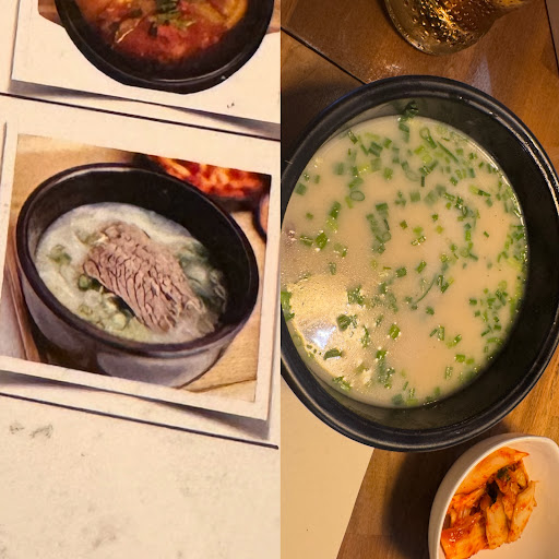 The waitress this time was different from the one we had on our first visit. I ordered the Savoy ox bone soup (사골설렁탕), but what I was served looked different from the picture on the menu. When I asked, the waitress replied word for word, “it is exactly the same.” I said, “if you say so,” in most Korean restaurants abroad I’d expect a manager to step in if a customer feels something is wrong. No one came over to check if everything was all right at all.