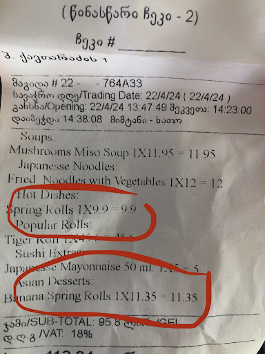 Read moreI don’t usually post reviews, but this is a case. Me and my friend had Ramen, 2 rolls, tea (bag) and juice. Ramen was not great, not terrible - I don’t know why the chose to add sweet(!) omelette instead of just boiled egg, which is classic for centuries. Anyway rolls were just awful, and we waited it for 30 min (Monday afternoon, empty restaurant, 4 people in kitchen). We were really hungry and at hurry so I didn’t care a lot and didn’t complain. But the bill was ~140 lari which is insane!!! It’s a mall tiny caffe in mall! I can forgive you bad quality food, but not restaurants prizes. I have never eaten any less worthless food in Tbilisi for almost an year. One star for nice waitress, one for ok ramen. Thank you. Will...