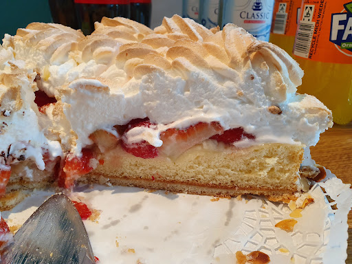 Der Erdbeer Baiser Kuchen war wie gewohnt sehr lecker. Er wurde gerade frisch aus dem Ofen geholt, sodass der Kuchen noch warm und nicht richtig ausgekühlt war. Beim anschließenden Bewegen ist er dann leider gerissen. Das war für uns persönlich nicht weiter schlimm und dem Geschmack hat es natürlich auch nichts gemacht.