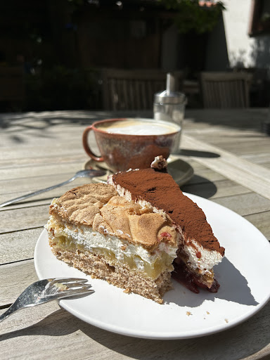 Das Parken ist schon ein Erlebnis. Es gibt vor dem "Cafe" nur 2 Parkplätze. Unangenehm ist es, durch ein Wollgeschäft laufen zu müssen, an einem stark riechendem Seifenregal vorbei zu gehen um dann ganz tief hinten eine Tür zu finden, die mit Cafe beschriftet ist. Ich wollte schon wieder umdrehen, da die Lage an einem Personalraum erinnert und erweckt nicht den Eindruck, dass es dort zu einem Cafe führt. Geht man durch die endlich gefundene Tür, findet man sich in einer absolut unpassenden Raumaufteilung wieder, die an eine Wohnung mit Tischen und Stühlen anstatt Cafe erinnert. Ganz hinten durch findet man eine Großküche (weiße Fliesen, Metall Theke und Arbeitstische) das ist der Raum, in dem der Kunde begrüßt wird und sich aus einem Glaskühlschrank (Hochkant) Torte aussuchen kann ca. 3-4 Meter entfernt. Die Bedienung überschlägt sich vor Freundlichkeit. Die Kuchen sehen teils lecker aus, schmecken aber nicht wirklich gut. Die Sahne ist ungesüßt und die Torte ist dann einfach in Form gepresst. Ich würde TK Torte um ein vielfaches vorziehen. Irgendwie wirkt alles so halbfertig. Man bezahlt in einer Gastroküche so zwischen Tür und Angel, während gearbeitet wird. Schulnoten: Ort: Mitten in Wohngegend 5 Zugang Wollgeschäft/Empfang in Gastroküche: 6 Atmosphäre: 5 Geschmack von Torte und Kaffee: 4 Freundlichkeit des Personals: 2 (zu überschwinglich)