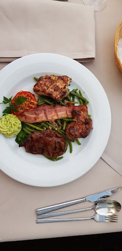 Nachdem wir uns dann aus der Handvoll der restlichen Gerichten etwas ausgesucht hatten, begann die Köchin das Fleisch auf den großen Schwenkgrill mitten im Raum zu legen. Kurz darauf, bemerkten wir, dass die Gesellschaft am Nachbartisch auf einmal begann, im Durchgang ein Keyboard und ein Cello aufzubauen. Scheinbar gab es etwas zu feiern und das sollte mit nervtötendem Katzenjammer in einer Lautstärke getan werden, die eine Unterhaltung zwischen den übrigen Gästen nur noch schreiend möglich machte. Nach 10 Minuten hatten die Musikanten aber ein Einsehen. Vermutlich ist ihnen aufgefallen, dass außer ihren Bekannten jeder andere Gast sichtlich genervt war. Als dann endlich das Essen kam, erlebten wir die nächste Enttäuschung. Der Feuerspieß lag lieblos und einsam auf meinem sonst leeren Teller. Naja, vielleicht schmeckt er wenigstens, dachte ich mir. Pustekuchen! Das Fleich zu lange gegrillt, staubtrocken und nur mit Kräuterbutter essbar. Das Rumpsteak meiner Mutter, das extra "etwas mehr durch als Medium" bestellt wurde, begann beim Anschneiden auszubluten. Der Restaurantbesitzer, freundlich darauf angesprochen, legte das Steak wieder auf den Grill und stellte es nach einigen Minuten ebenso lieb- wie kommentarlos auf unseren Tisch, wobei er demonstrativ in eine andere Richtung blickte. Auch das restliche sehr junge Aushilfs(?)personal war sichtlich überfordert. Die Getränkebestellung, die eine viertel Stunde auf sich warten ließ, wurde letzten Endes auch noch falsch gebracht. Als der Chef beim Abräumen gefragt hat, ob es geschmeckt hat und wir mit einem klaren "nein" antworteten, war ihm das sichtlich egal, denn er ging wortlos weg und überließ das Kassieren seinen Mitarbeiten. Man sollte nicht meinen, dass man in dem doch etwas höheren Preissegment so schwache Leistung von Küche und Bedienung, gepaart mit solcher Arroganz erleben...
