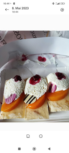Dann habe ich die 3 TortenstĂŒcke gekauft und die VerkĂ€uferin pratschte stĂ€ndig auf den Torten rum, um das Papier darĂŒber zu befestigen.