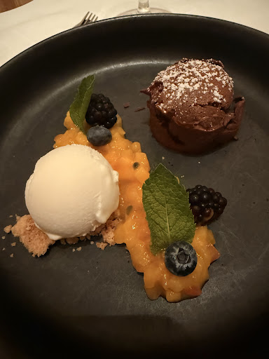 Auch beim Dessert setzte sich der durchwachsene Eindruck fort: Der Schokoladenkuchen war ĂŒbermĂ€Ăig bitter und lieĂ jede feine Abstimmung vermissen.
