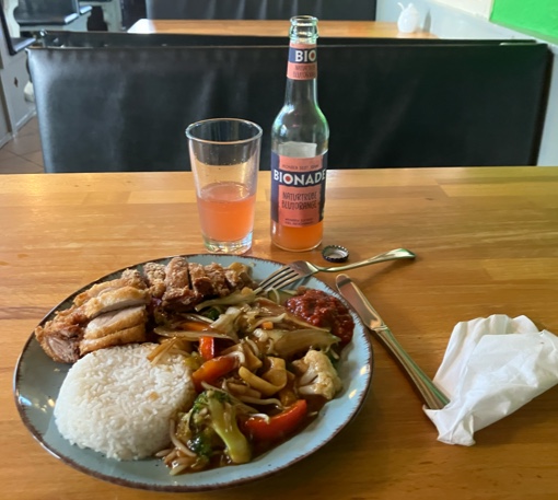 Always delicious, very fast service and inexpensive. The staff there (mostly) only speak German but all you have to know is numbers to order. The portions are big, hearty and healthy and the Thai chili sauce on the tables is really good to give it some extra flavor and kick, although not needed. We eat a meal here almost every day (we don't have a kitchen yet and must eat out) but we keep coming back because...