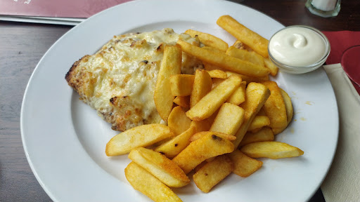 So jemandem ein Essen zu servieren ist fraglich. Ich habe mich selbst geschämt, dass ich meine Freunde dorthin mitgenommen habe. Die Panade war nicht knusprig, das Fleisch war in zwei Stücke geteilt, trocken und alt, anstatt saftig und frisch zu sein. Die Kartoffeln schmeckten, als wären sie vom Vortag aufgewärmt.