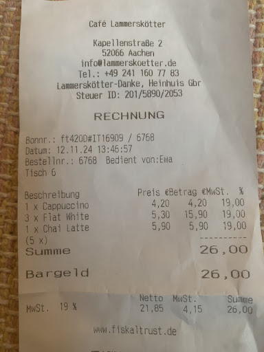 Read moreEigentlich wollte ich die Qualität der angebotenen Speisen z.B. beim Frühstück loben, ebenso auch das der schöne Kuchensortiment und auch den Umstand, daß Lammerskötter nach der Übernahme des Café "Zum Mohren" jetzt auch die Eistorten von dort ins Programm in Burtscheid übernommen hat...