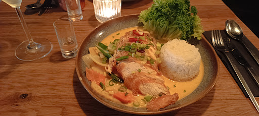 Read moreWe waren een beetje vroeg, wat de sfeer een beetje minder maakte. Maar dat lag niet aan het restaurant. Wij zijn van nature niet gewend Oosters te eten. Een knoflook is het pittigst wat we kunnen verdragen. Toch dit restaurant binnen gegaan omdat het er echt gezellig uit zag. De kaart heeft heel netjes alles in het Duits en Engels aangegeven. En ook staat het er bij of het pikant is of niet. Het zelfde aantal gerechten was ook in een vegan variant te verkrijgen. Dus volop keuze voor iedereen. Het personeel is zeer vriendelijk en de service voortreffelijk. Je hoeft niet lang te wachten op het eten. Wat wel iets beter kan is het vragen of we nog iets wilde bestellen. Ik heb zelf moeten aangeven nog wat drinken te willen en na het hoofdgerecht werd er niet gelijk gevraagd of we nog een desert wilde. Maar zeker niet een groot punt of als storend ervaren. En dan het eten.. Vooraf krokante garnalen en een rol van garnalen en ijsberg sla. Geen foto helaas, want we waren zo snel met aanvallen dat die er bij ingeschoten is. Maar erg lekker. De hoofdgerechten waren geroosterde kip en eend met rijst en groenten. Zowel de kip als eend was heerlijk zacht van binnen en krokant van buiten. De groenten waren gaar, maar niet klef. Een beetje crispy zelf. Het was witte rijst, maar de korrel was droog. En over dat alles was een beetje zoete soya achtige saus gegoten.die het geheel nog smakelijker maken. En dan de portie grootte. Het was een groot bord vol. Echt een volwaardige maaltijd. Zelf aan de grote kant. Wat ik wel prijzig vond was het water. Eur 7.50 voor een fles van 0.75 liter vind ik best veel. Maar al met al een super ervaring. Echt...