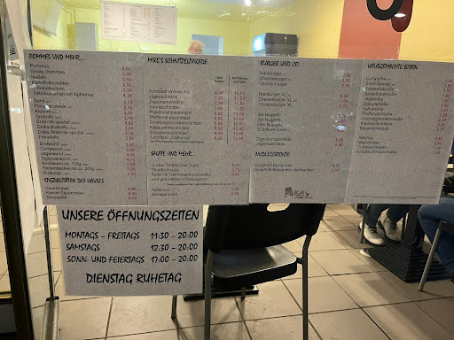 Mike’s Pommes und mehr, benieuwd wat we hier kunnen eten, we betreden de zaak die naast de toonbank en wat tafels met stoelen weinig invulling kent. Ons wordt duidelijk dat we plaats kunnen nemen en de bestelling aan tafel opgenomen wordt. Wij nemen zodoende plaats en openen de menukaart. Hierin staan naast frieten en snacks ook diverse andere zaken zoals burgers, schnitzels, etc. Onze keus valt op een friet met currysaus, een friet speciaal, een kroket, 6 kipnuggets met zoetzure saus en een curryworst met gebakken uitjes. De vriendelijke man die ons bedient neemt de bestelling op.