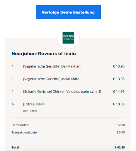 from Lieferando we ordered Dal Makhani, Malai Kofta, chicken Vindaloo (sehr scharf) and 6 Naan. the food came hot and we were happy.