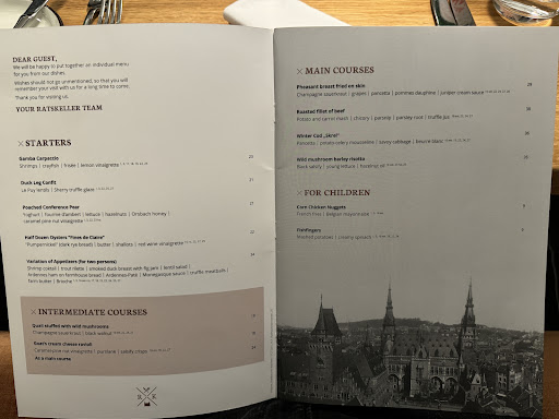 We believe this restaurant shares its kitchen and staff with the Postwagen, where we tried to eat first but with no success as we were “forgotten” upstairs… We then decided to try Ratskeller, as the menu was appealing and the other restaurants nearby seemed to offer mainly fast-food. The food was overall very good, although I wasn’t too fond of the pheasant (but the poached pear and oysters as entrées were both good, and the cod as well). The only problem was, again, the service. The restaurant didn’t seem very big, and although we saw at least 5 people working there (including the same lady that was at the other restaurant), everything took a long time (just bringing the menu and taking our order took around 30 minutes, and when we finished ordering our dinner, we were asked if we wanted the wine list, even though the very last thing we asked for was a bottle of a Chardonnay… 🤷🏻♂️🤷🏻♂️🤷🏻♂️ oh, and the bottle didn’t come, just a glass, but that’s ok). We also noticed that some other people that were already there seemed to wait a long time for their dishes as well. The staff was friendly and they spoke English and French, which was a plus, but the service was a little underwhelming especially since we were already hungry from our wait at the Postwagen. I would still recommend this restaurant and prefer to give it the...