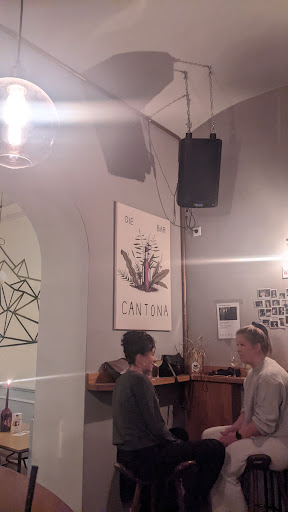 Die Bar Cantona habe zum ersten Mal recht kurz nach der Eröffnung besucht und nahm für mich mit, dass ich hier nicht zum letzten Mal gewesen bin. Die Bar besticht mit schlichtem leichtretro-alternativem Charme in hölzernem Schultischstyle, eingehüllt in gemütlich gedämpften Licht. Bei allen spontanen Besuchen wurde ich stets nett und freundlich begrüßt. Man kann hier gemütlich einen Kaffee trinken oder mit Freunden seine paar Bierchen zischen oder aber auch einige ausgewählte Gin Tonic genießen. Und das Beste daran – man kann auch was leckeres Essen zwischendurch. Bei meinem ersten Besuch samt meiner besseren Hälfte konnte ich den verlockenden Speisen aus der Karte nicht entsagen. Die kleine Karte ist multikulinarisch angelegt und besticht mit fairen Preisen. Den Hinweis in der Karte, dass nur Frisches und teilweise Regionales verwendet wird und die Speisen alle selbstgemacht sind, habe ich mit Wohlwollen und Freude wahrgenommen. Wir bestellten die hausgemachten Süßkartoffel Fritten mit Korianderwurzel Aioli, sowie Suberec, Rauchauberginen Creme und mediterrane Gemüsecreme mit Brot. Der Koch selbst brachte die Speisen raus und erzählte noch schnell was zu seinen Speisen. Man merkte ihm seine Leidenschaft für das Kochen an, und so was finde ich super. Das selbstgebackene, dunkle und noch warme Brot schmeckte gut, nicht sauer, hatte eine weiche Krume mit inensivem, malzigem Geschmack und eingebackenen Gemüsestückchen und eine krosse, rustikale Kruste. In Kombination mit der Rauchauberginenpaste war es ausgewogen kräftig im Geschmack, für die mediterrane Creme war das Brot zu dominant. Da wäre uns ein milderes, helles Brot lieber gewesen. (Ein solches wurde uns zum Probieren später am Abend auch nachgereicht). Die Cremes waren lecker und hatten eine gute Konsistenz, nicht zu breiig, man erkannte noch was drin war. Die bestellten Tschuberek wurden uns vom Koch mit den Worten, „Achtung innen sehr heiß, aber so schmecken sie am besten“ an den Tisch gebracht. Seine Motivation konnten wir durch ein Kompliment für die leckeren Cremes direkt stärken. Und mit den Teigtaschen sollte er auch Recht behalten, gut abgeschmeckte und feine Hackfleischfüllung. Die rustikalen Süßkartoffelfritten waren bombe, außen richtig kross innen kartoffelig. Die Aioli war spitze. Ein anderes Mal nahm ich die Auberginen im Tempuramantel, auch diese Kreation mit Waldhonig und Meersalz konnte mich absolut überzeugen. Den jungen Küchenchef muss ich hier noch einmal im Speziellen würdigen, ich finde die Speisen sehr gut, innovativ und doch ohne viel Chichi. Einfach spitze und weiter so… Die Bar ist eine gute und lässige Location, die zum Verweilen einlädt, mit Service der aufmerksam ist. Qualitativ gute Ware sowohl bei den Getränken als auch bei den Speisen....