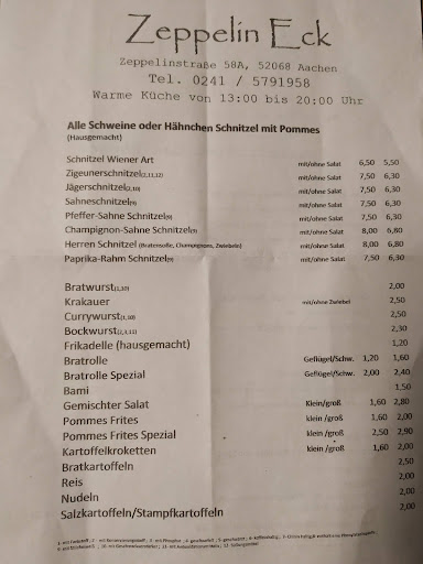 Sehr leckeres Essen in rustikaler Atmosphäre. Es handelt sich beim Zeppelin Eck um eine Eckkneipe, deren Einrichtung etwas in die Jahre gekommen ist. Das stört die zahlreichen Stammgäste aber überhaupt nicht. Das Personal ist sehr freundlich. Die angebotenen Speisen sind gut bürgerlich, sehr lecker und reichlich. Vor allem die polnischen Spezialitäten sind sehr zu empfehlen. Das Preis-Leistungs-Verhältnis ist der Hammer. Für ein romantisches Dinner ist die Gaststätte aber nicht zu empfehlen. Wer nach Feierabend gut und zünftig bei einem leckeren Bier gut und günstig essen will, ist aber...