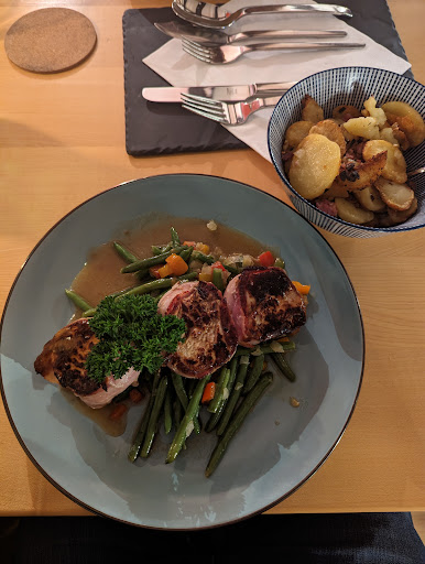 Wir haben vor einer Woche dieses Restaurant im Rahmen unseres Urlaubes besucht. Eigentlich ist eine Reservierung sinnvoll, aber wir hatten Glück und durften spontan hier verweilen. Mir kommen jetzt noch die Freudentränen, was Manchen vielleicht übertrieben erscheint, aber für uns war es ein ganz besonderes Erlebnis. Solch eines, welches ich zumindest unbedingt wiederholen muss. Schon die Begrüßung durch das Restaurantteam war immens willkommend. Solch eine Freundlichkeit bin ich nicht gewohnt. Die Speisekarte ist modern, auch klassisch, Crossover. Wir haben jeweils Vorspeise, Hauptspeise und Dessert sowie Wein bestellt. Man servierte uns als Gruß der Küche frisches Baguette mit hausgemachtem roten Pesto und Coleslaw. Schon das begeisterte. Die Aromen waren herausragend! Wie gut kann ein doch so einfacher Coleslaw sein? Ich habe in Irland gelebt und fühlte mich zurückerinnert. Aber auch das Pesto war überwältigend. Wir hatten als Vorspeise eine Brotsuppe mit pochiertem Ei, Hauptspeise in Kokos panierte Hähnchenspieße mit aromatischem Curry und Dessert ein Blaubeerparfait auf Eierlikörspiegel. Worte beschreiben das Geschmackserlebnis nicht! Ich kann nur sagen, man muss hier gegessen haben, wenn man gute Küche mag. Ich war so fasziniert dass ich auch den Koch kennenlernen durfte. Was für ein beeindruckender Mann! Meine Begleitung und ich sind jetzt verliebt und ich weiß dass ich hier nicht zum letzten Mal war. Einzig dafür plane ich im Herbst noch einen Urlaub (wir wohnen leider ein paar hundert km entfernt), um hier noch einmal (oder zwei oder gar drei mal) essen gehen zu können. Ganz, ganz herzlichen Dank für diesen wundervollen Abend, die liebevolle Bewirtung durch das wahnsinnig tolle Team und diesen Koch. Wir...