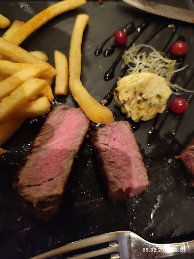 das filet stück kam innen saftig außen zäh verbrannt, wie ohne butter und gewürze zwischen zwei el heizplatten gelegt und dann vergessen, die einzige würze kam aus der schlecht funktionierende pfeffermühle,