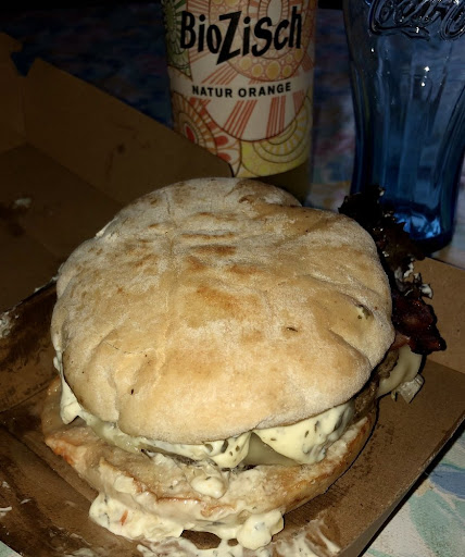 Ich bestellte über Lieferando, jedoch erstmalig nicht um liefern zu lassen sondern um selbst abzuholen. Ich entschied mich für einen "Giant Burger" (160 g Patty, doppelt Käse, Zwiebeln, Tomaten, Salat und Mayonnaise) mit extra Bacon und extra dänischer Remoulade für 10,28 €, als Abholzeit wählte ich 18:15 Uhr. Nach einem Rundgang durch die gut besuchte Ahrensburger Innenstadt ging ich um 18:15 Uhr zum zentrumsnahen Mendoza, ich fand eine typische, rustikale Steakhouse-Einrichtung vor und das Restaurant war sowohl drinnen als auch im Außenbereich gut besucht. Ein freundlicher Kellner begrüßte mich, ich zeigte ihm meine Bestellbestätigungsmail und erhielt sofort meinen abholbereiten Burger. Ich begab mich dann zur nächsten Bushaltestelle für die kostenlose Heimfahrt.