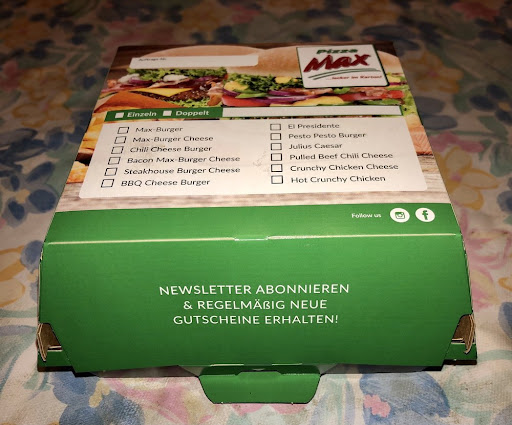 Read moreIch hatte wieder Appetit auf Burger und diesmal führte ich mir das Burgerangebot von Pizza Max in Ahrensburg zu Gemüte. Pizza Max ist ein Berliner Unternehmen, das in einige andere deutsche Städte expandiert ist. Als ich Ende 2020 aus dienstlichen Gründen temporär in Hamburg und im Liefergebiet einer Pizza Max-Filiale gewohnt hatte, hatte ich bereits vorgehabt die Burger von Pizza Max zu probieren, war aber nicht dazu gekommen, daher wollte ich dies nun nachholen. Die Speisekarte umfasst eine ansehnliche Auswahl an Hamburgern und Chickenburgern. Ich bestellte mir über Lieferando einen Bacon-Cheeseburger mit doppelt Fleisch und einen Oldschool Burger mit Tomatenscheiben, Röstzwiebeln, dänischen Gurken, Ketchup, Snackdressing und extra Käse.