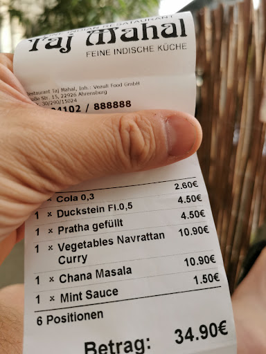 Wir waren heute im Taj Mahal Das Restaurant war komplett leer. Auf einen Sonntag Abend um kurz vor Sechs kein gutes Zeichen. Aber Aufgrund der aktuellen Teuerung zunächst kein Alarmzeichen. Außerdem hatten wir zu Corona-Zeiten 2020/21 diverse Male Speisen im Lieferdienst bestellt. Reichliche Portionen und guter Geschmack. Somit sind wir geblieben und haben bestellt. Die Karte ist übersichtlich, die Bedienung versteht mäßig gut die deutsche Sprache. Bestellt hatten wir Chicken Tikka Tandoori für 15,90€ und Chicken Tikka Masala für 14,90€ Das Tandoori kam auf einem Teller: 6 (sic!) Stückchen Hähnchenfleisch, etwas Blattsalatgarnitur mit Dressing in einer Tellerecke und drei Schälchen mit Sauce. Auf Nachfrage, ob dies ein Hauptgericht sei, wurde dies bestätigt. Als Vorspeise wäre es ohne Salat. Reis war keiner dabei, den habe ich von meinem Gericht zugegeben, immerhin wurde der Reis auf Nachfrage kostenfrei nachgereicht. Das Masala war geschmacklich gut, kam in einer Porzellanschale, aber auch hier nur 5 Stückchen Fleisch und ein wenig Sauce. Ein Sättigungsgefühl kam nicht zustande. Eine Warmhalteplatte war bei meinem Gericht nicht dabei, wäre bei der Portion aber auch wirklich überflüssig gewesen. Unsere Tischnachbarn, die später dann doch kamen, hatten eine Warmhalteplatte. Dafür hatte das Gericht mit Blumenkohl und Kartoffeln (welches aus Allergiegründen extra ohne Blumenkohl geordert wurde) natürlich reichlich Blumenkohl dabei. Fazit: Früher durchaus solide im Lieferdienst, wird aufgrund der Teuerung scheinbar an der Menge gespart, obwohl der Preis angehoben wurde. Ein durchschnittlicher Inder mit großen Preisen und kleinen Portionen. ACHTUNG: Für Allergiker nicht wirklich geeignet. Zusagen zur Zubereitung werden gemacht, aber nicht gehalten. Eine Sauce ohne Milch enthält Milch, abbestellte Zutaten werden trotzdem verarbeitet, das ist so...