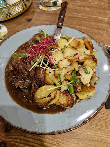 Zum Essen: Die Kürbissuppe war geschmacklich super, leider maximal lauwarm und bei der Portionsgröße dann auch kalt, obwohl ich mich wirklich beeilt hatte. Die Miesmuscheln waren... sehr komisch. Ich esse Miesmuscheln wirklich in jeder Lage, das war das erste Mal(!), dass ich einen Teller mit Miesmuscheln nicht aufgegessen und zurückgehen lassen musste. Abgesehen vom Geschmack: Ich schätze die Essensdeko mit Gemüse sehr, vor allem beim Zwiebelrostbraten, allerdings ist zuviel auch nichts. Bei den Muscheln bestand gefühlt der halbe Teller aus Gemüse, das war etwas drüber und kann man sich für das Nächste Mal ja überlegen, ob da vielleicht etwas weniger besser ist. Mein Fall war es nicht, aber darüber lässt sich bekanntlich streiten. Nichtsdestotrotz: Das Essen war leider nix und leider schon zum zweiten Mal. Das letzte Mal hatte ich einen "Zwiebelrostbraten" bei dem aber ein komplett anderes Stück Fleisch drauf war und das dazu recht durchwachsen. Ich könnte jetzt noch Punkte vom Essen meiner Freunde aufführen, aber ich bewerte ausschließlich meine Erfahrung.