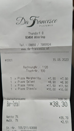 Read moreIf you ever find yourself in the vicinity of Ainring you should definitely visit pizzeria da Francesco. The restaurant is very cozy, family oriented and a cute establishment sorrounded by nature. The owners are a lovely young couple,the food is amazing, you will eat authentic and traditional italian cuisine prepared with care and detail. The stuff is kind and will make sure you are well taken care of. They have an interesting choice of Calabrian digestives and all food is homemade. I would highly reccomend this place to everybody who enjoys a quality meal and a great value for good money. Don't miss out on this...
