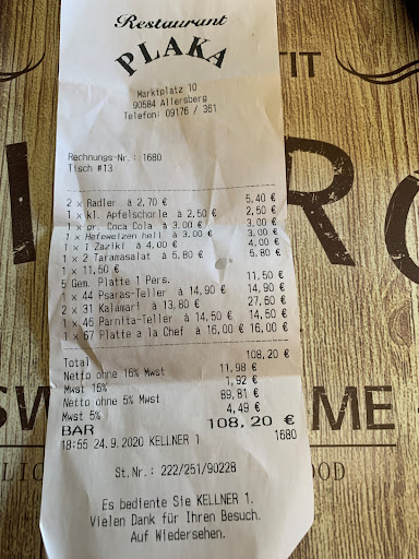 Read moreWaren am 24.9 dort zu Essen und hatten vorher bei der Reservierung darum gebeten draußen zu Essen, wenn das Wetter passt. Angekommen, dann meinte die Bedienung draußen?? NÖ, die Tische wären nicht gereinigt, obwohl wir um 17:45Uhr noch Sonnenschein und Temperaturen von 23Grad hatten... Thema Essen: gemischte Vorspeisenplatte, Taramasalat aus dem Supermarkt (kostet übrigens im griechischen Supermarkt in Nürnberg Kohlenhof nur 11 Euro für 2 Kg), schwache Leistung, das er nicht hausgemacht war,.... Hauptgang: Der Tomatenreis zu den Calamari schmeckte meiner griechischen Schwiegermutter nicht besonders...Meine Frau hatte eine Platte mit Giros, Calamari und Leber, die Leber war trocken und halb verkohlt...Mein Sohn hatte eine Platte ala Chef mit Lammkotelett, auch das war völlig übergrillt, das Bifteki schmeckte nur nach Oregano, der Oregano war im Bifteki nicht oben drauf (also im Fleischteig) ... Ich hatte eine gemischte Platte mit Giros, Calamari und einem Souvlaki, auch der war hart dunkel und zu trocken. Am Nachbartisch saßen 6 Damen, zusammen so ca. 420 Jahre (alles Corona Risikopatienten), in dem ersten Speiseraum, welcher nicht gelüftet oder sonst was war. Die komische mini Schweißer Maske die der Wirt trug, hätte er auch unten lassen können...Mann o Mann....Als die Damen ihr Essen durch den Wirt serviert bekamen, reklamierten diese, dass sie eigentlich Pommes dazu gewollt hätten....der Wirt hat nur griechisch meckernd registriert und ist wieder in der Küche verschwunden (ist blöd, wenn mehrere Leute halt auch noch griechisch sprechen)....Dann kam die Bedienung mit den gleichen Tellern wieder, sie mögen doch erst mal das Essen anfangen, dass es nicht kalt wird und sie bringe dann die Pommes nach und den Reis müssten sie ja nicht essen.... als sie dann wieder kam, hatte sie 2 mal Pommes zu wenig, die Damen hatten noch Salz dazu verlangt, da ja heute kein Salzstreuer mehr am Tisch steht, das hatte sie vergessen und als sie dann beim abräumen darauf hin angesprochen wurde, meinte sie nur, na da habe ich ja was gutes für ihren Blutdruck getan....na sauber,,, man hätte sich auch entschuldigen können..Als ich dann die Rechnung verlangte und fragte ob ich mit Karte zahlen könnte, meine sie, Kartenzahlung haben wir nicht....Ist wohl der Chef zu geizig wegen der Kartenzahlungsgebühren??.Heutzutage eigentlich ein No-Go...! uns wird das Lokal so schnell nicht wieder sehen, dafür gibt es genug bessere griechische Lokale in der Umgebung