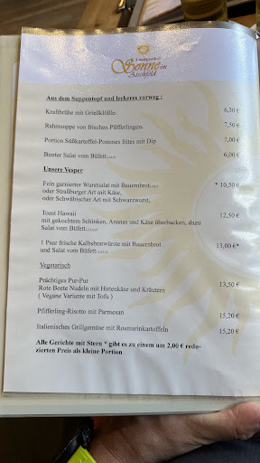 Read moreNach dem absoluten Reinfall des Hotels am Kurgarten in Wolfach bis ich auf der Suche nach einer angemessen erschwinglichen Übernachtungsmöglichkeit in der Nähe von Alpirsbach über den Landgasthof Sonne 'gestolpert'. Glücklicherweise.||||Was die Wirtsleute und die Mitarbeiter an Freundlichkeit, Aufmerksamkeit bieten, was die Sauberkeit des Zimmers, die Ruhe, das Frühstück und alles andere anbelangt, ist die Sonne weit mehr als ihren Preis wert,||||Das Zimmer ist zwar nicht als schickes Designerzimmer zu bezeichnen. Wer so etwas an die erste Stelle seiner Suchprioritäten setzt, liegt hier falsch. Die Zimmereinrichtung entspricht einem Landgasthof. Also eher rustikal und nicht mehr ganz neu möbliert. Mit Ausnahme der Dusche/Toilette. Dieser Bereich ist komplett neu (Stand 09/2017), modern. Und BLITZSAUBER. Wie das ganze Zimmer.||Der Ausblick von dem umlaufenden Balkon ist jetzt nicht gerade ein Blick in überwältigende Natur. Aber dafür ist es ruhig, Und trotz der wenig befahrenen Strasse, die nach Alpirsbach führt, mit frischer Waldluft gesegnet.||||Das Frühstücksbuffet verdient wirklich den Namen Buffet: verschiedene frische (!) Brötchen, Brotsorten, süsse Aufstriche, Wurst (nicht aus einem Aluminiumschälchen sondern frisch vom Metzger), Käse, Joghurt, Früchte, Cerealien, Saft - alles reichlich vorhanden.||||Nach einem freundlichen "Guten Morgen" der Chefin und ihrer Frage nach Kaffee oder Tee kommt sogar die Frage, ob man ein Ei möge. Woraus zu schliessen ist, dass im Falle das Ei frisch gekocht wird und nicht bereits seit Stunden abgedeckt in einem Korb vor sich hin abkühlt...||||Man kann es als Nachteil, man kann es aber auch als Vorteil sehen: Mobilfunkempfang ist dort oben keiner möglich. Es gibt keinen Antennenmasten, der die Smartphones/Tablets mit gefunkten Informationen versorgt. In der Sonne selbst wird aber kostenfrei WLAN angeboten. Für die, die sich der Mobilfunk- und Internetdetoxierung verweigern.||||Führt mich der Weg irgendwann wieder einmal in den Nordschwarzwald, nach Alpirsbach, das nahe gelegene (20km Entfernung) Freudenstadt oder ähnliches, dann weiß ich, wo ich mich zur Ruhe bette und auf die Wirtsleute und das Frühstück freue: im...