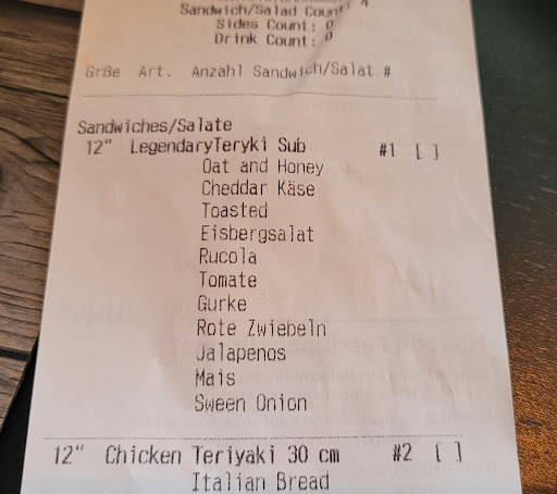 Da es sich hierbei um eine Serviceleistung handelt habe ich die Sterne beim Service abgezogen. 3 Sterne Abzug mag man eventuell zu viel finden, allerdings beziehe ich hier noch einen weiteren Vorfall ein, bei dem der Subway in Alsdorf selbst Aktionsgutscheine in Papierform rausgegeben hat, die 2 Monate gelten und sie selbst dann nach dem 1. Monat aus diesem Aktionsprogramm ausgestiegen sind und man dann im 2. Monat dahin fährt, einen Sub zusammen stellt und dann an der Kasse gesagt bekommt, dass der Aktionsgutschein nicht mehr akzeptiert wird und man quasi keine andere Wahl hatte, als den Sub zum Vollpreis zu kaufen. Das war leider mehr als ärgerlich.