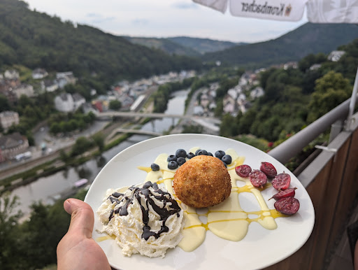 Read moreWir sind Heute Sonntag im Restaurant eingekehrt. Wir hatten ein Schnitzel Waldeslust mit Rahmchampignon Sauce.....genügend Champignon !,!! und fritiert Kartoffelstäbchen......besonders lecker und keine Kartoffelmuspampe Sehr schön * dazu wurde ein kleiner gemischter Salat gereicht frisch und leckeres Dressing. Dann hatten wir eine Rindsroulade mit Rothohl und Klöße....keine Beutelware wirklich wie Zuhause gute Portion und lecker. Als drittes Essen hatten wir auf Empfehlung des Kellners......sehr Nett und Kompetent mit flottem Guten Service Schnitzel mit Barbecuesauce und Kartoffel-Kroketten gute Qualität und Geschmack dazu ein kleiner frischer Salat. Selbst die in Beuteln gereichte Majonaise ist ein gutes leckeres Produkt.....Unser Kompliment an die Küche. Wir hatten zweimal 0,5Ltr. Krombacher Weizenbier ohne Alkohol und einmal mit plus eine Tasse Kaffee..... der echt heiß war und gut nach Kaffee schmeckte. Nicht unbedingt selbstverständlich!!! Preis dafür 76,- soundso € Klasse Essen guter Preis für ein echt gemütliches vor Historie strotzendes Restaurant. Wir durften zum Essen die Terrasse mit wunderbarem Ausblick benutzen....einfach rundum ein Geheimtip Wert freundlich nett aufmerksam aber nicht aufdringlicher Sercice. Kommen gerne wieder für kleine Familien...