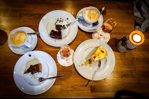 Gerne sind wir dort eingekehrt, draußen war es nämlich sehr ungemütlich. Und dann betraten wir ein sehr stimmiges Cafe, sehr geschmackvoll eingerichtet, bewusst offene Backsteinwände, sorgfältiger dosierter Putz, warme Farben an Boden und Holz-Mobiliar. Der Kamin im 1. Geschoss macht es noch runder. Selbstgebackene Kuchen mit Zutaten aus der unmittelbaren Region stehen zur Auswahl und Kaffee, der für das Cafe besonders geröstet wird. Ergänzt durch eine sehr freundliche und entspannte Inhaberin....