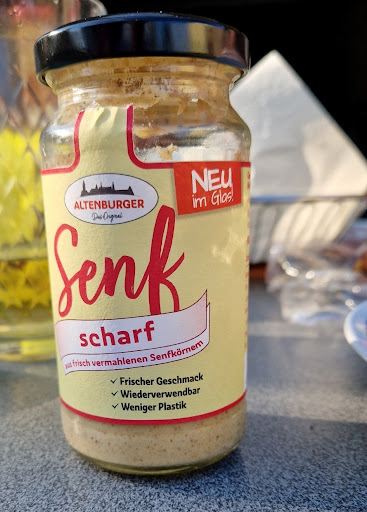 Read moreDer Altenburger ist der leckerste Senf unter allen verfügbaren Marken! Meine persönlichen Favoriten Altenburger mittelscharf und scharf, sowie der Leipziger und der Bauernsenf! Qualitätsprodukte, die ihr Geld wert sind!! Nur diese länglichen Gläser sind absolut unpraktisch!! Man kommt ja nicht mal mit einem Speiselöffel hinein. Sobald das Glas halbleer ist wird die Produktentnahme nervig! Eine Becherform wäre günstiger und Gläser mit 250ml oder mehr wären auch nicht schlecht! Zumindest bei den Grundsorten! Vielleicht wird das ja mal bedienfreundlicher! Und bis dahin bleibt Altenburger trotzdem mein...