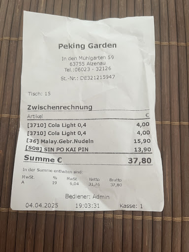 Ich und meine Partnerin hatten Lust auf asiatische Küche und sind spontan nach Alzenau gefahren bzw. ins Peking Garden. Wir sind ziemlich so zur Eröffnung (18:00) gekommen, deshalb waren wir die einzigen Gäste. Beim Betreten des Seiteneingangs (von der Parkplatz-Seite) wurden wir schnell von der Kellnerin übertölpelt und platziert. Ambiente war ok aber die Musik war teilweise schon etwas zu laut, für mein Geschmack. Wir dachten uns aber, wenn wir schon hier sind dann versuchen wir es. Die Karten haben wir bekommen und alles wurde bestellt. Zwischenzeitlich waren wir beide auf die Toilette wo beide Seifenspender nicht funktionierten. Beim Servieren wurde uns alles separat gebracht. Erstmal der Wärmebehälter mit Reis zu meinem Gericht ( S08) - Hähnchen süß sauer. Danach kam die Bestellung meiner Begleitung (Nr. 36) Irgendwann später kam dann der Rest meines Essens! In einem Laden das sich als Restaurant ausgibt - ist mir sowas noch nie passiert ! Dazu war auch mein ergänzender Teller dreckig und wurde natürlich ausgetauscht aber da war unser Skepsis-Level mehr als nur angeregt! Und es war NULL was los - wir wollten zusammen essen und nicht irgendwann überhaupt was essen. Wir wollten einen schönen Abend verbringen. Leider kam dem gar nicht so…. ACHTUNG die Nr. 36 Malaysia Gebratene Nudeln entfällt Speck! Aber auf der Speisekarte im Restaurant war das nicht angegeben! Da sich aber alles am Tellerboden befand, ist es uns leider nicht direkt aufgefallen. Wir waren entsetzt und auch enttäuscht, natürlich haben wir anschließend mit der Kellnerin gesprochen. Sie war fassungslos und konnte auch kein Wort von sich geben. Angewidert wollten wir die Rechnung sofort bezahlen, sie kam mit einer kleinen (to go) Karte und argumentierte dass es ein Druckfehler sei in der Hauptspeisekarte! Und hat uns anschließend voll abkassiert. Ich musste mich wirklich zusammenreißen in diesem Moment. Wir essen kein Schwein und es ist schon ein großer Vertrauensvorschuss, wenn wir in so einem Restaurant gehen. Aber das war sowas von ein NO GO !!!!!! Diese Gastronomen verstehen ihr Handwerk nicht und sind grenzlos unverschämt. Nicht nur dass eine Entschuldigung angebracht gewesen wäre & das wir in jedem normalen Restaurant mit mindestens einem Discount gerechnet hätten dürfen, wurden wir schnell unter dem Tisch gekehrt nachdem Motto „Haut jetzt ab“! - wir haben jetzt neue Opfer. Des Weiteren hatten wir Cola Zero bestellt - sie hat okay gesagt und uns Cola Light gebracht! Sowas hat in dieser Szene nichts verloren. Ich habe am Ende voll bezahlt und weiß das Karma am Ende immer alles regeln wird. Absolut nicht zum empfehlen - es gibt nichts wieso man dort hingehen soll außer man sucht ein großen...