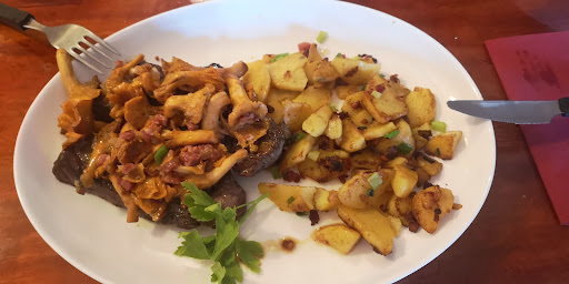 Read moreDann hatte ich wohl Pech. Mit dem Verzehr des Wildschweinbraten hätte wohl auch ein Löwenrudel Probleme bekommen, Klöße waren noch nicht fertig, der alternative Wildgulasch mit den sehr bissfesten Salzkartoffeln war bestenfalls genießbar, der kleine Salatteller mag vor einigen Tagen vielleicht geschmeckt haben. Heute nicht mehr. Wie ich von Nachbartischen hörte, waren wohl u.a. auch Fisch und Nudeln nicht verfügbar. Die handgemalte Rechnung beinhaltete dann auch den teureren Braten, nicht den Gulasch. In 2 Punkten muss ich den Vorberichtern Recht geben: die Bedienung war freundlich und die Preise sind okay. Das reicht aber nicht, um nochmal...