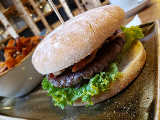 The only good thing about this place is the presentation. The presentation of the restaurant is attractive with the birch trees, wood tables and food plates. The server was curt and semi-rude insisting I needed an English menu, when I can speak 3 languages (including German since my husband is German). She then kept asking me questions in English for me to continue to respond to her in German. The hamburger was a premade frozen patty that tasted like a Walmart frozen patty. The fries had a strange taste, probably whatever they were fried in? They also come up in Gluten free searches with GF bread options, but its "bread less". Any restaurant could then be GF if they simply remove the bread. Overall, an overpriced dinner for the poor quality and service. Won't ever go back to any of the chains, don't recommend it, unless you don't know what a real burger...