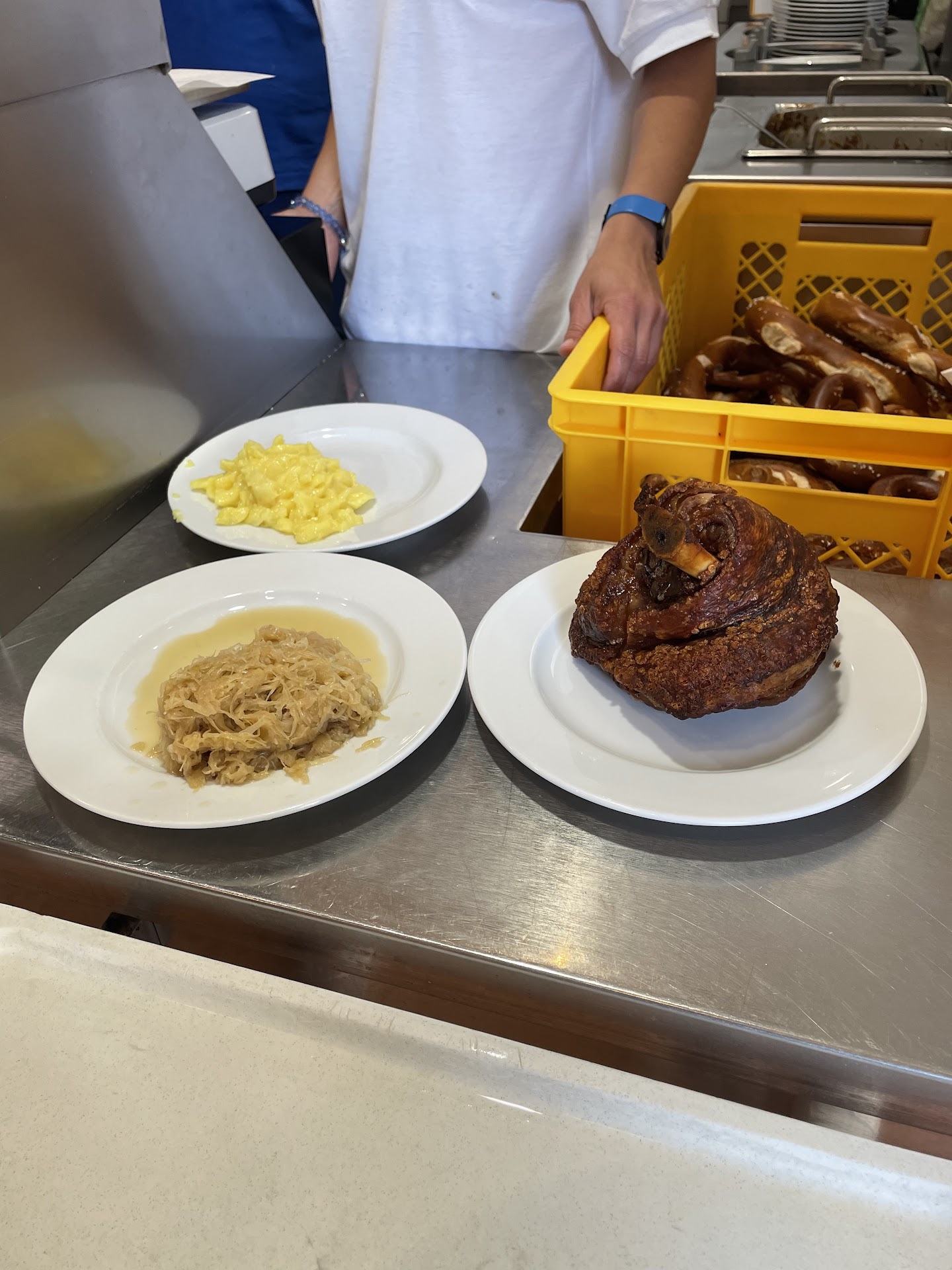 The restaurant is a typical Biergarten fare, you gave a section for brozeit (cold cuts and breads) and a hot meal session with Pork knee and pork belly. They are charged by weight, but the sides are a fixed price.