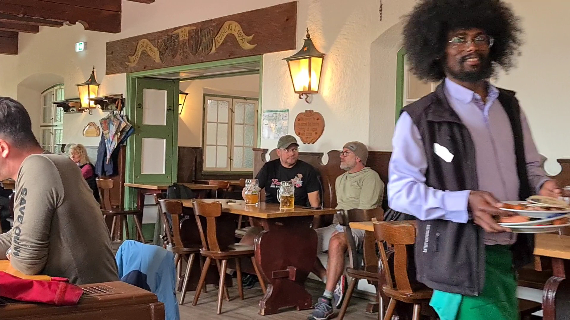 There was a waiter with a huge afro, he made me smile. He was constantly smiling. He seemed to enjoy his job and being there. Marvelous. Loved it. This huge hallway eating with 100++ people really impersonates everything, and there were many people eating. Barely free table inside. Outside almost no one. It was raining. But the guy's huge hair and constant smile really raised the...