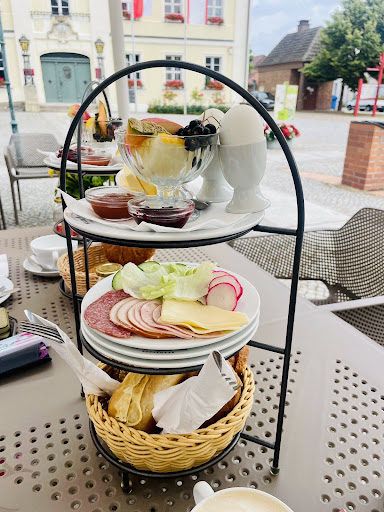 Read moreNettes Café in zentraler Lage am Markt. Personal war freundlich mit einem Schuss Berliner Charme. Preise von günstig (z. B. Kaffee) bis kräftig. Der Stramme Max für € 7,50 (lt. Aushang im Angebot) wäre für den Preis akzeptabler gewesen, hätte man die beiden - allerdings ziemlich großen und leckeren - Eier auf zwei Scheiben Brot verteilt statt auf einer zusammengequetscht. Selbst wenn dann noch ein paar Schinkenwürfel extra benötigt würden, macht man bestimmt keinen Verlust. Das Brot war auch sehr lecker. Der Kaffee ist kräftig und ebenfalls gut. Das Eis ist von einer regionalen Manufaktur und sehr gut. Die Sortenauswahl ist leider sehr begrenzt, und ganz schlimm sind die nach Pappe schmeckenden...