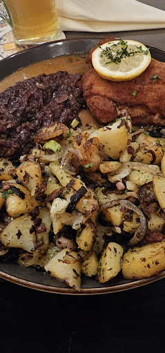 Schönes Uriges Restaurant, alles sehr Sauber und ordentlich. Das Personal war sehr freundlich und zuvorkommend. Allerdings ist es für uns eher ungewöhnlich von mehreren Kellnern bedient zu werden. Zum Kassieren kamen dann 2 Damen, die eine Tippte ein und las dann die Speisen und Getränke noch einmal vor und die andere kassierte ab. Untereinander scheint das Vertrauen wohl nicht sehr hoch zu sein, na ja. Die Bratkartoffeln schmeckten deutlich nach "alten" Kartoffeln und die Zwiebeln mit dem Speck waren teilweise (wie im Bild zu sehen)verbrannt. Hinzu kommt die absolute geschmacksneutralität der Bratkartoffeln. Mehr Mut zum würzen wäre hier angebracht. Der Rotkohl hingegen war Hammer, wirklich sehr gut abgeschmeckt . Das gefüllte Schnitzel mit Rouladenfüllung ist wirklich eine pfiffige Idee, wenn, ja wenn da nicht das zähe Schnitzel und die Panade gewesen wären. Die Panade war wirklich hart, voll mit Öl oder Fett. Die Füllung hingegen war wieder Klasse. Wenn ich es nicht genau wüsste, dann würde ich vermuten das daß Schnitzel frittiert wurde. Butterschmalz war das aber keinesfalls. Bei einem Preis von 23,90€ hätte ich zumindest das erwartet. Die Soße die dazu gereicht wurde passte so garnicht dazu, schlecht zu definieren was das war, weder Schwein noch Rind, vielleicht angerührt, ich will aber nichts unterstellen. Meine Frau hatte Gulasch mit Knödel, dieser schmeckte nach Paprika und Peffer, war weich und Salzlos. Unser Kind hatte Chicken Nuggets mit Pommes. Die Pommes waren Ok und die Nuggets sehr Salzig und nicht selbstgemacht. Aufgrund dieser Erfahrung ist mein Fazit: Die Preise sind völlig überzogen für diese Qualität. Wie oben schon erwähnt. Mehr Schein als sein. Meine Bewertung bezieht sich auf die von uns bestellten Gerichte und ist meiner Meinung sein Geld nicht wert, schade. Wir geben gern auch mehr Geld aus fürs Essen, aber die Qualität muss dann auch stimmen. Da ich selber Gastronom bin, finde ich die Bewertung angemessen. Konstruktive Kritik führt zu...