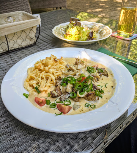 Read moreSchön gelegenes Lokal, ABER... ... man könnte viel mehr drauß machen. Dem ein oder andere wird das urige Innere gefallen, uns hat es mehr an ein altes Vereinsheim erinnert. Es wirkt durch die Fliesen kalt und es fehlt ein Gesamtkonzept und eine Modernisierung würde auch nicht schaden. ... von der afrikanischen Spezialitätenwoche haben wir deutlich mehr erwartet. Die Vorspeise (Kürbissuppe) war sehr lecker, nur eine Scheibe Brot wäre gut dazu gewesen. Beim Hauptgang (Hähnchen Bunny Show) haben uns die typischen Gewürze und der Geschmack gefehlt. Auf Reis serviert wäre das als indisches Curry durchgegangen. Zudem wurde es auf einer dicken Scheibe Toast serviert, welches schnell durchgeweicht ist und matschig wurde (hat mir persönlich nicht gefallen). .... Durch den Blick in die Küche konnten wir sehen, dass billiges JA! Vanilleeis verwendet wird. .... Die Chefin bereitet die Nachspeisen zu und wechselt häufig zwischen Service und Küche. Dabei werden die Hände leider zu wenig gewaschen, was beim Anfassen von Essen...