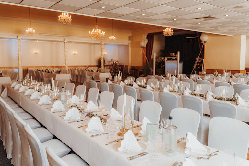 Der großzügige Festsaal beeindruckt auf den ersten Blick: Hohe Decken verleihen dem Raum Weite, während die prächtigen Kronleuchter ein warmes, elegantes Licht ausstrahlen, das sofort eine romantische Stimmung schafft. Besonders abends, wenn sich das Licht in den Gläsern und auf den glänzenden Oberflächen spiegelt, entsteht eine zauberhafte Atmosphäre, die zum Verweilen und Feiern einlädt.
