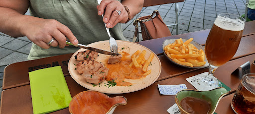 Katastrophe war die Bedienung. Bestellt wurden zuerst die Getränke. Leider kamen anstatt 2 bestellte Sprite 2 nicht gewollte Fanta. Naja wir haben gesagt ist okay trinken wir kann ja jedem passieren. Dann bestellten wir essen zu jedem essen kann individuell Bratkartoffeln oder Pommes gewählt werden. 2 Gerichte sollten mit Bratkartoffeln kommen diese kamen mit Pommes am Tisch hieß es dann okay ich bringe noch die Bratkartoffeln leider kamen sie nachdem die Rinderleber schon verzerrt war. Schön wäre gewesen es zusammen zu essen. Die Kinder wählten jeweils Pommes mit Chicken Nuggets. Dann kam ein großer Teller voll und zwei leere kleine Teller die Bedienung hatte einfach mal selbst entschlossen das die Kinder sich den großen Teller teilen. Nach 2 mal nachfragen bekamen wir dann auch die eigentlich extra mit bestellte Majo und Ketchup.