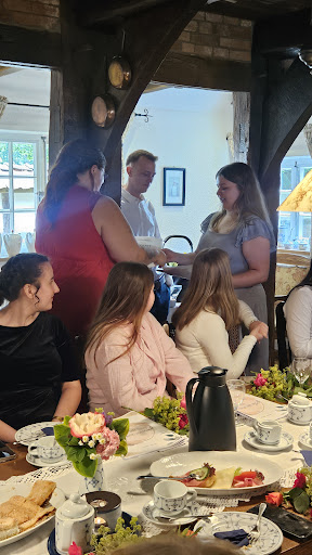 Read moreWir haben am 26.06 hier unseren Abschluss gefeiert. Als ich das "Backhäuschen" gesehen habe war ich schon leicht enttäuscht es sah einfach alt klein und sehr unfeierlich aus draußen war es noch ok es gab genug sitz Möglichkeiten leider war vieles feucht. Drine war es an dem tag sehr heiß und wir waren ungefähr ca 20 Personen dafür ist der Raum definitiv zu klein man bekam kaum Luft und durch das alte Ambiente (Stühle,Tischdecke,Dekoration etc) roch es auch nich besonders zu essen gab es Schnitten mit Wurst und Käse nichts besonderes und 2 Sorten Kuchen Apfelkuchen mit Bienenstich mit Kaffee an die Tee trinker wurde nicht gedacht dennoch konnte man sich nachträglich auch Tee bestellen dauerte natürlich bis dieser kam. Im großen und ganzen würde ich da nicht noch mal hin gehen auch wen der Hof mit seinen Rosen sehr schön aussieht jedoch für die Anzahl an Personen einfach zu klein an dem langen Tisch sahsen die meisten von uns und für die es kein Platz gab mussten sich an einen einzel Tisch an der Seite zu 5 alleine hinsitzen und auch bei der späteren Zeugniss überreichung waren ständig Stühle im weg und die Lehrer mussten schon gefühlt auf der Treppe nach oben stehen weil wie gesagt kein Platz da war so hab ich mir das nicht...