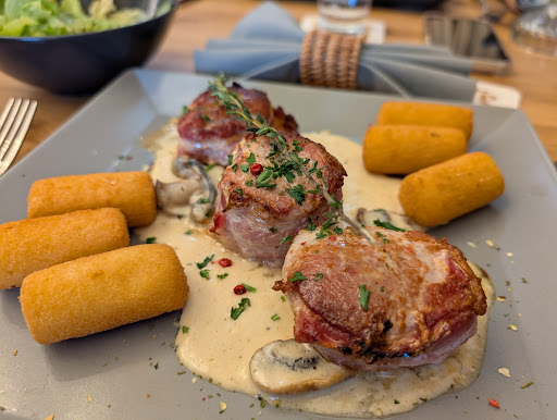 To start, I opted for the Beef Carpaccio: delicate, melt-in-the-mouth slices of beef presented with impeccable finesse. For the main, the Mühlenschmaus was a true highlight – succulent pork fillets wrapped in smoky bacon, served with a silky mushroom and cream sauce and accompanied by a generous, crisp side salad. Every element was beautifully plated – a feast for the eyes as well as the palate. The flavours were exquisitely balanced, showcasing both skill and quality produce.