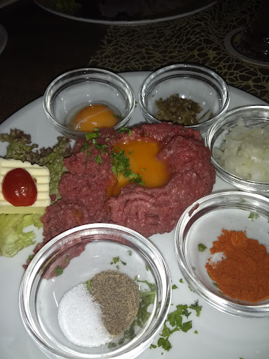 Rindertartar mit Garnitur aus Gewürzen, Zwiebeln, Kapern und frischen leckeren Brot. Alles frisch aus guten Zutaten.