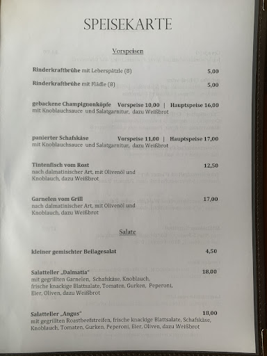 Read moreIch vergebe hier bewusst nur einen Stern, Obwohl das Essen an sich ansprechbar und gut gelungen und in der Portion durchaus reichlich war. Das Negative beginnt mit einem Blick auf die Homepage. Es wird eine Speisekarte ausgewiesen, allerdings, offensichtlich bewusst, ohne Preise. Die sind nämlich mittlerweile heftig überteuert, die beliebten Cevapcici kosten hier sage und schreibe 14 €, wohl gemerkt ohne Beilagen Salat. Das bekommt man im näheren Umfeld zwischen 8,90 € und 12,50 € inklusive Beilagen Salat. Auch die anderen Hauptgerichte sind ohne Beilagensalat und damit im Vergleich zum Wettbewerbsumfeld um etwa 30 % überteuert. Den Ausschlag für nur einen Stern, gab jedoch folgendes: zum eigentlich leckeren und optisch ansprechende Salatteller Angus für 18€ gab es zwei kleine Scheiben Baguette. Als um eine weitere Scheibe gebeten wurde, brachte man auf einem Tellerchen 3 Scheiben, stellte die jedoch mit 1,50 € in Rechnung. Das ist unverschämt !!! Dass der beim Kroaten eigentlich obligatorische Verdauungsschnaps auch nicht mehr gereicht wird, rundet das negative Bild leider ab Meine Empfehlung daher wenn es um Kroaten geht, bei denen das Preis-Leistungs-Verhältnis noch wirklich stimmt, die Salztrög Stuben...